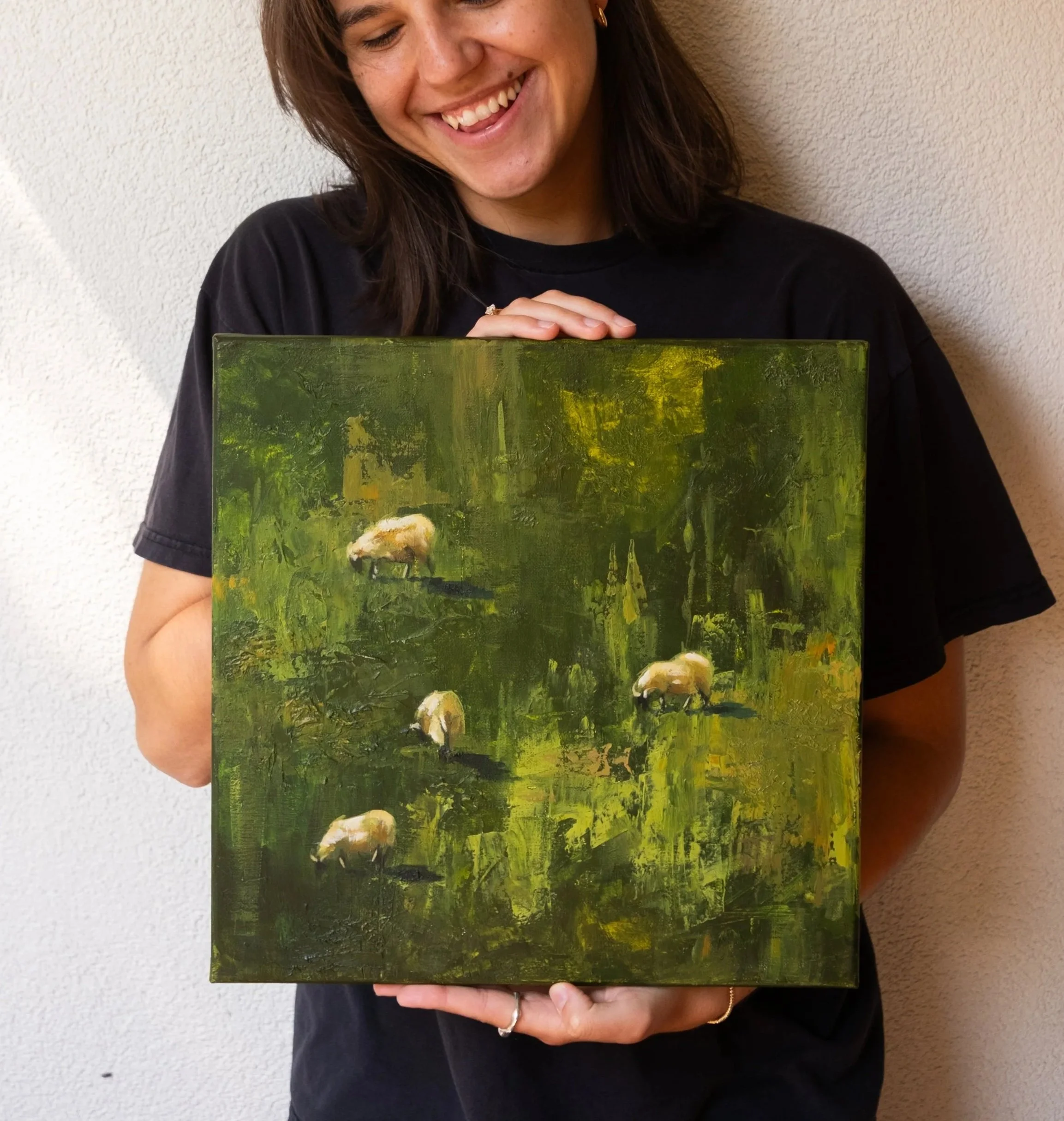 I built up the greens layer by layer, trying to get some depth and movement into the surface. The sheep ended up being small and simple. They're there to give it warmth and a bit of life, but the landscape is really the main character.